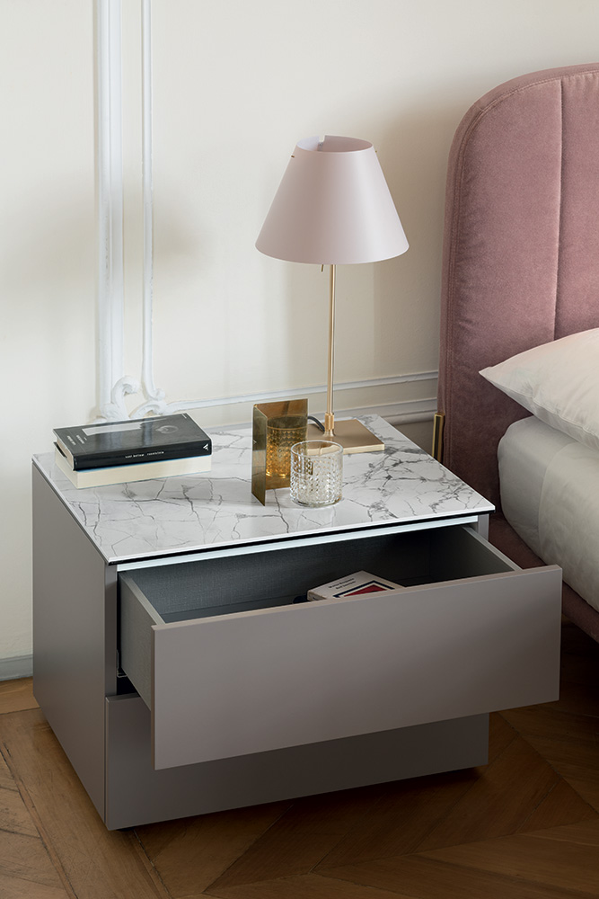 Zum System UNIVERSAL gehört auch eine Kollektion mit Schubladenmöbeln für den Schlafbereich. Nachttische, Kommoden und Hochkommoden für den Bett- und Schlafbereich, die sich je nach Ausführung und Design der Fronten, die lackiert oder aus Naturholz sein können, optisch verändern.