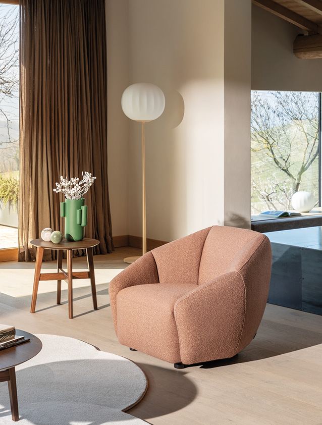 In a modern reinterpretation of the 70s, soft padding give body to the backrest and armrests, which extend in a cozy continuous shape for a warm embrace during moments of relaxation.