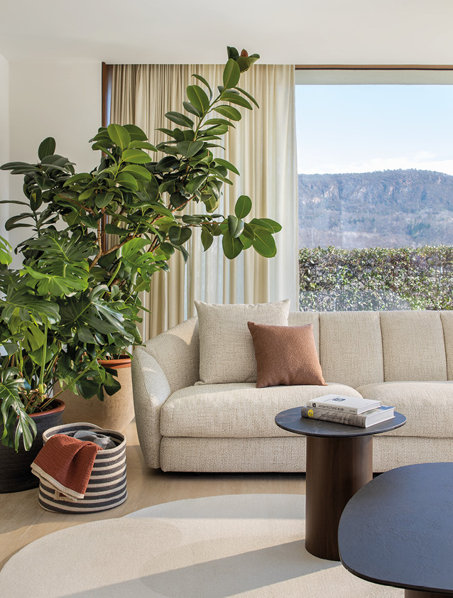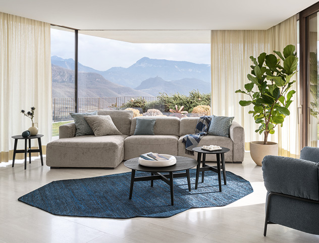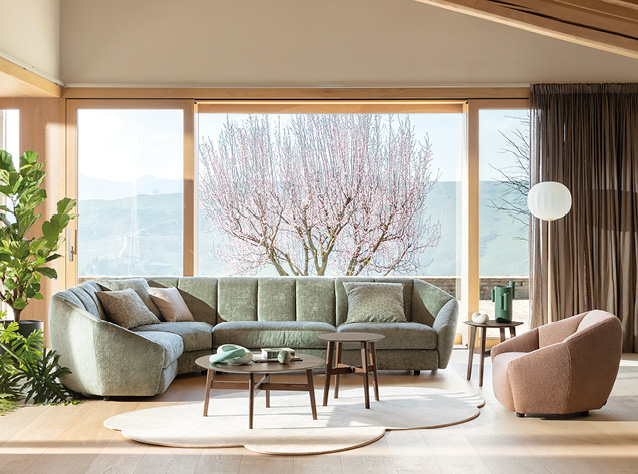 Large padded cushions with essential and contemporary lines give body to a sofa, which invites you to be enveloped by its softness. The stitching that recalls the shape of a smile is the aesthetic detail that gives character to the line.