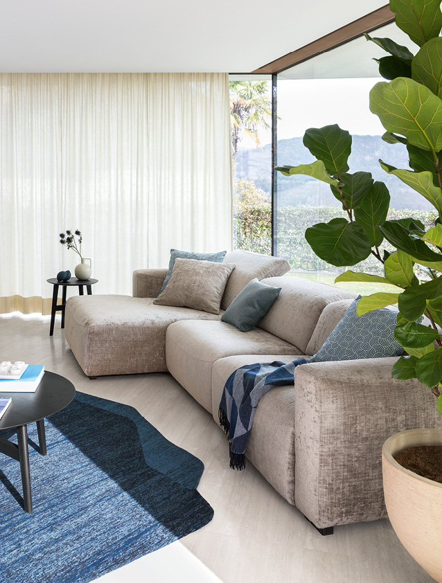 The standard headrest rises manually and completes the comfort of the seat, so as to change from a more formal vertical seat to a reclining position for a cozy comfort. The extremely soft shapes in appearance and comfort, create in each arrangement the right atmosphere to enjoy your time at home.