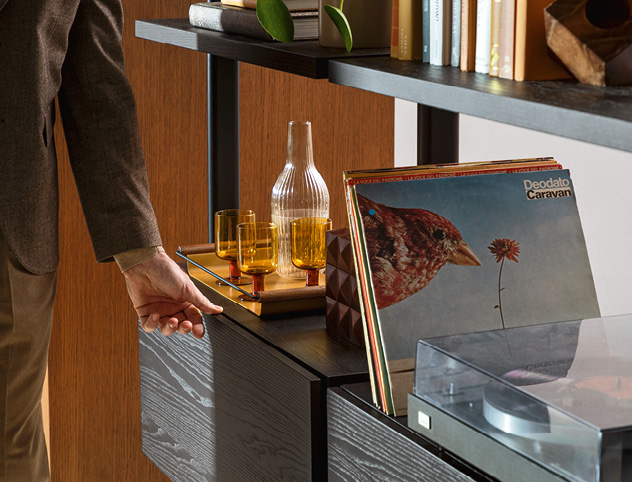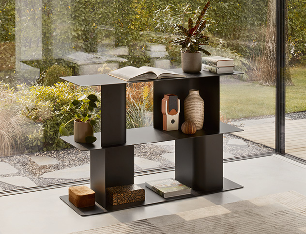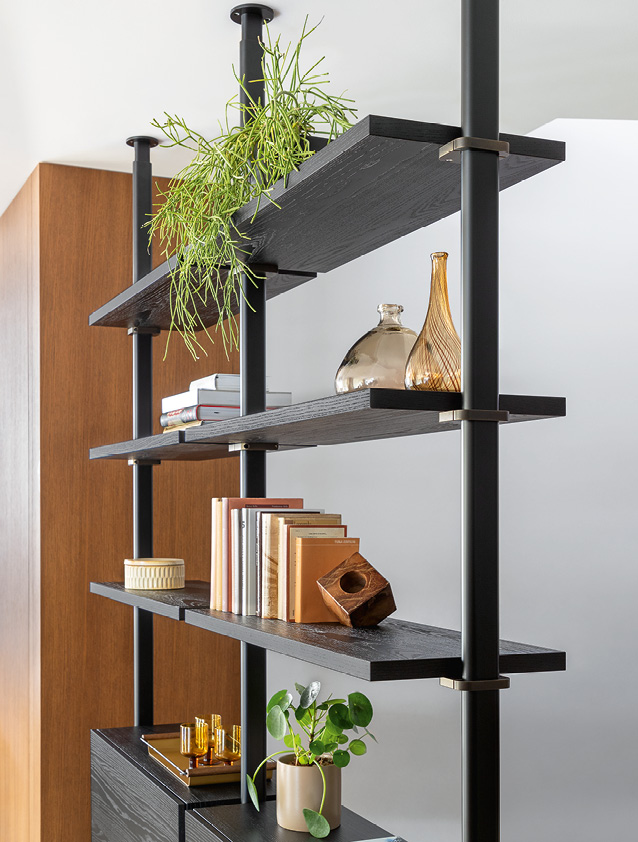 Carv’s modularity allows you to create horizontal or vertical compositions and being double-sided and with a ballasted base it can be placed in the center of the room to separate the spaces.