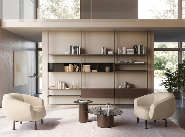 The Cluster bookcase was born from the need to create a modular, versatile and multifunctional bookcase system. A furnishing system that could be extremely flexible, able to satisfy every design need, both aesthetic and functional. The double-sided finish of each element allows it to be used as a room divider. A multifunctional system obtained thanks to the variety of modules as drop down door containers, showcases, shelves, drawers and desk tops and the series of integrated accessories such as mirrors and coat hangers. It is also offered in two aesthetic variants as the uprights are designed to be fixed to the ceiling or to the wall.