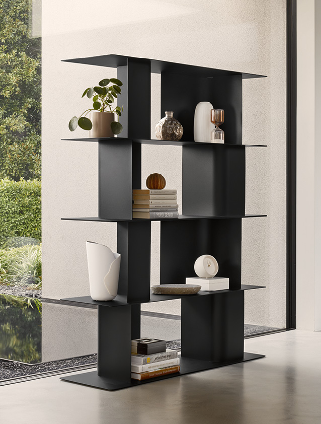 Thin steel sheets form the frame of the Carv bookcase, softened by the wide curves of the vertical supports, thus defining a minimal and at the same time warm and reassuring appearance to the vertical supports that are arranged to give dynamism to the composition and maintain visual continuity when several modules are placed side by side or overlapped.