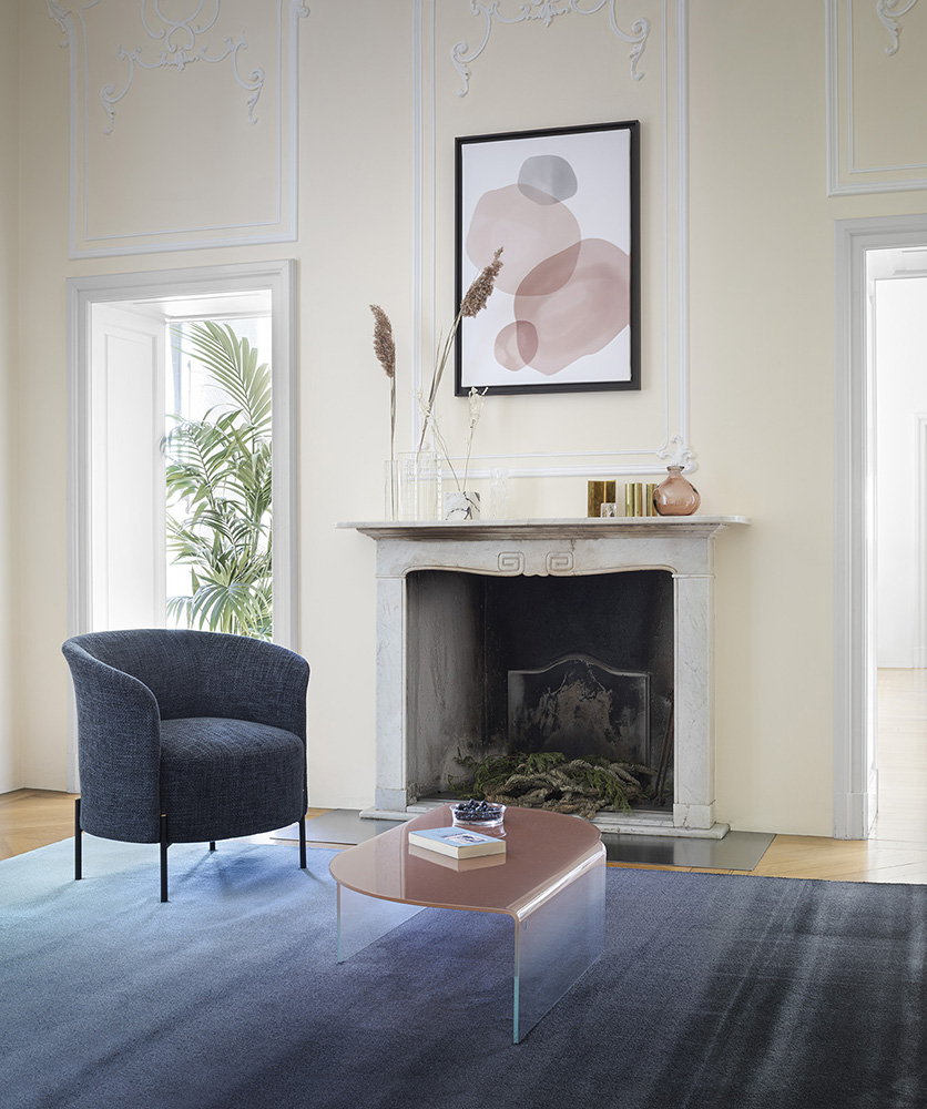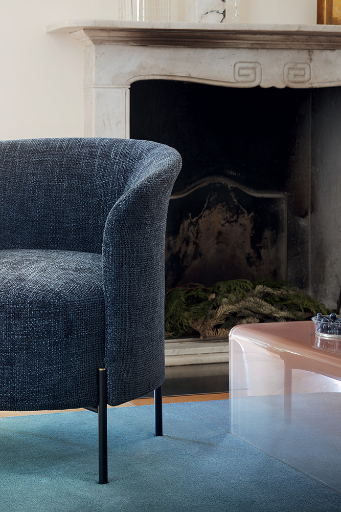Poltrona lounge accogliente ed elegante. Il sedile è realizzato con una struttura a cinghie elastica che supportano il poliuretano, garantendo comodità e durata. Per garantire lo spessore esile, abbinato a delle curve armoniose, lo schienale è realizzato in poliuretano schiumato a freddo, rivestito e tappezzato. 4 piedini a vista in metallo supportano la struttura e ne conferiscono eleganza, grazie alla parte terminale nelle finiture ottone lucido o black nikel.