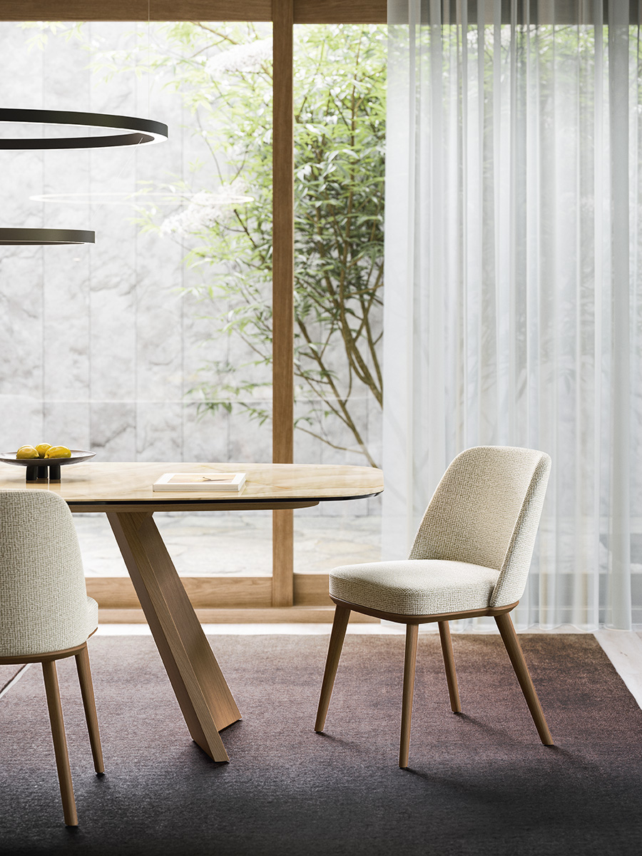La nuova sedia imbottita FOYER dona un senso di comfort e relax a chi vi si abbandona. Merito della scocca avvolgente ed imbottita in multistrato curvato e del morbido sedile con struttura a cinghie elastiche, supportato dal raffinato basamento in legno a quattro gambe conificate, realizzato con tonalità che ben si sposano con la finitura della scocca.