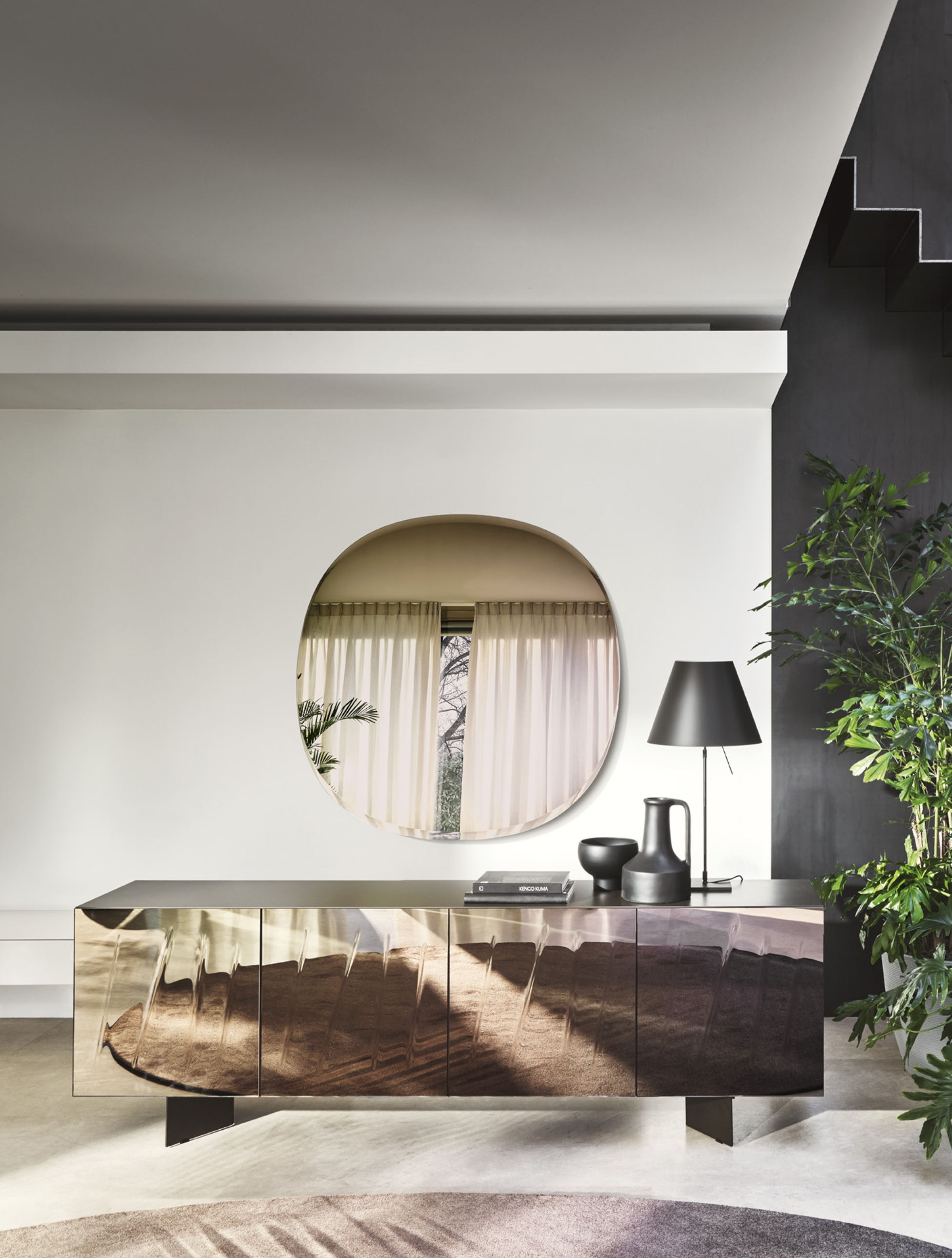 Ein wichtiger Tisch, der dafür geschaffen wurde, der Mittelpunkt des modernen Wohnzimmers zu sein. Calla zeichnet sich durch seine Basis aus, die an eine Blume erinnert: solide, aber gleichzeitig leicht, bestehend aus zwei Metallplatten, die sich wie Blütenblätter ineinanderschieben und eine Kelchform bilden, die sich nach oben öffnet und Vitalität sowie Wiedergeburt suggeriert.