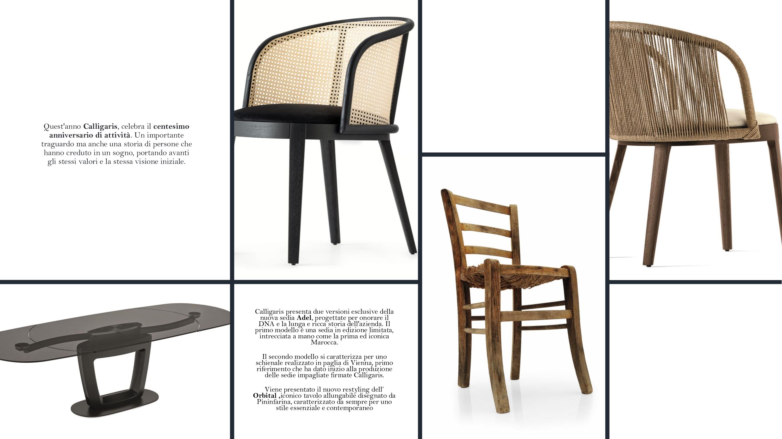 In occasione di questo importante anniversario, Calligaris presenta due versioni esclusive della nuova sedia Adel, progettate per onorare il DNA e la lunga e ricca storia dell’azienda. Due modelli innovativi che traggono ispirazione dalle origini di Calligaris. Il primo modello è una sedia in edizione limitata, intrecciata a mano come la prima ed iconica Marocca. Il secondo modello si caratterizza per uno schienale realizzato in paglia di Vienna, primo riferimento che ha dato inizio alla produzione delle sedie impagliate firmate Calligaris.