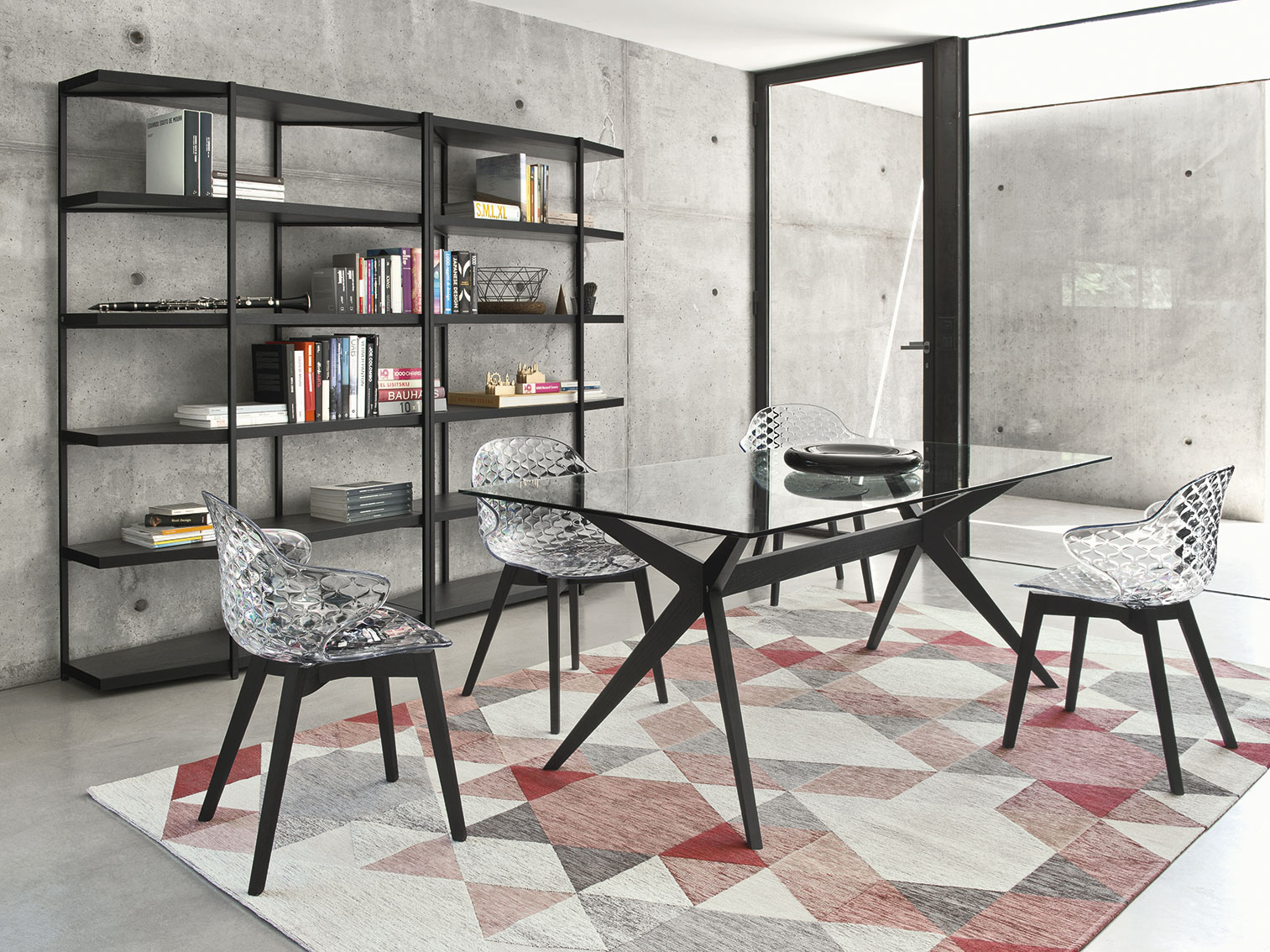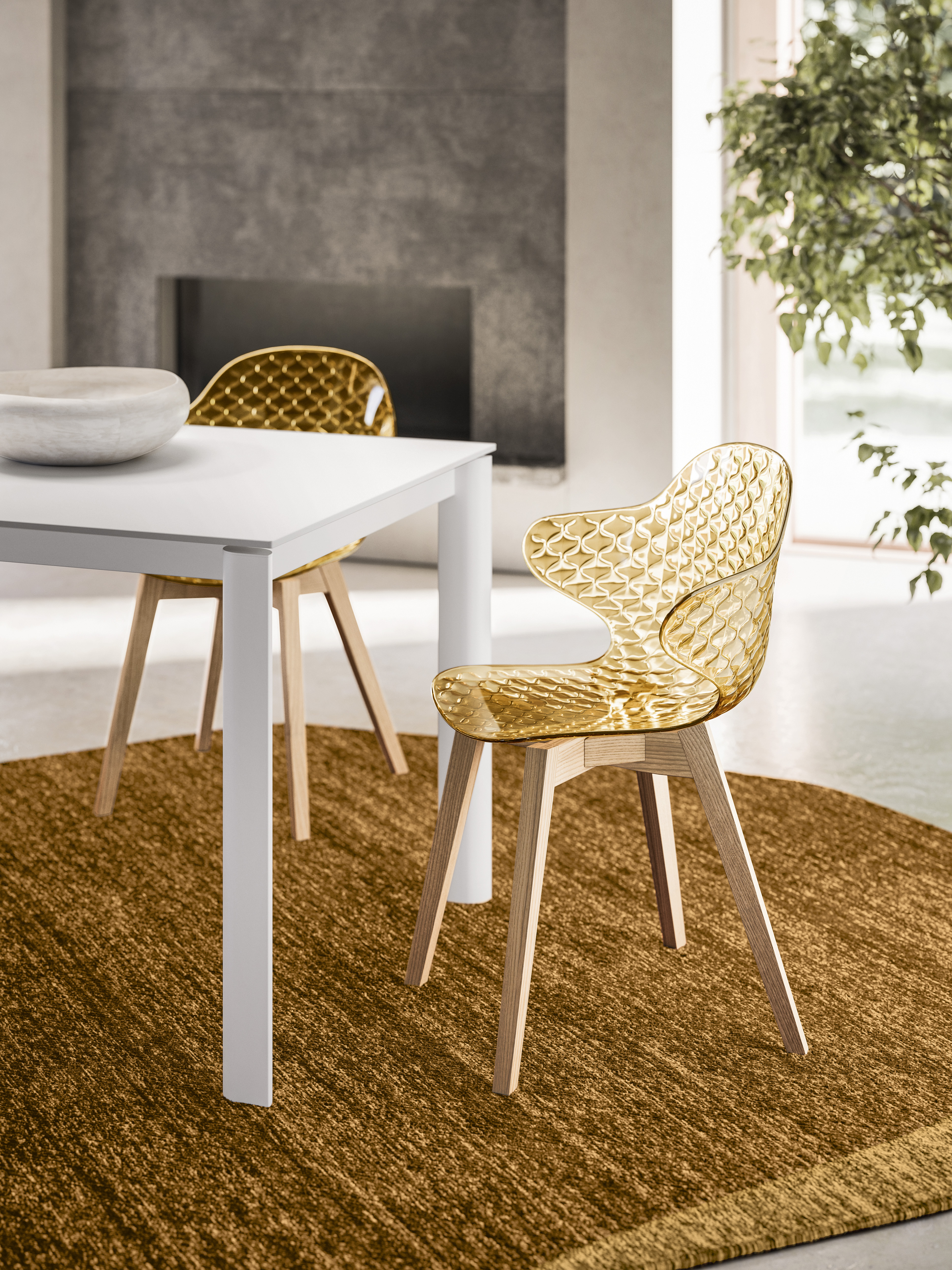 La scocca in policarbonato è realizzata in diverse tonalità trasparenti o coprenti ed è montata su un basamento a 4 gambe in legno. Scegli la tua preferita.