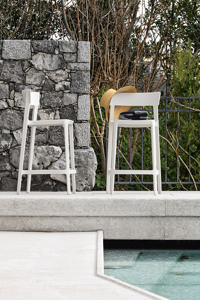 Colorido, apilable y funcional, el taburete SKIN responde a un lenguaje minimalista. Con su diseño simple pero a la vez rebuscado, este taburete es un aliado indispensable en cada casa. Resistente aunque ligero gracias a la innovadora tecnología air-moulding, una elaboración que permite obtener una resistencia excepcional además de reducir el peso del producto. Los pies de apoyo antichoque son de polietileno de alta resistencia e intercambiables. Está fabricado en polipropileno y cuenta con reposapiés. Se puede utilizar también en exteriores.