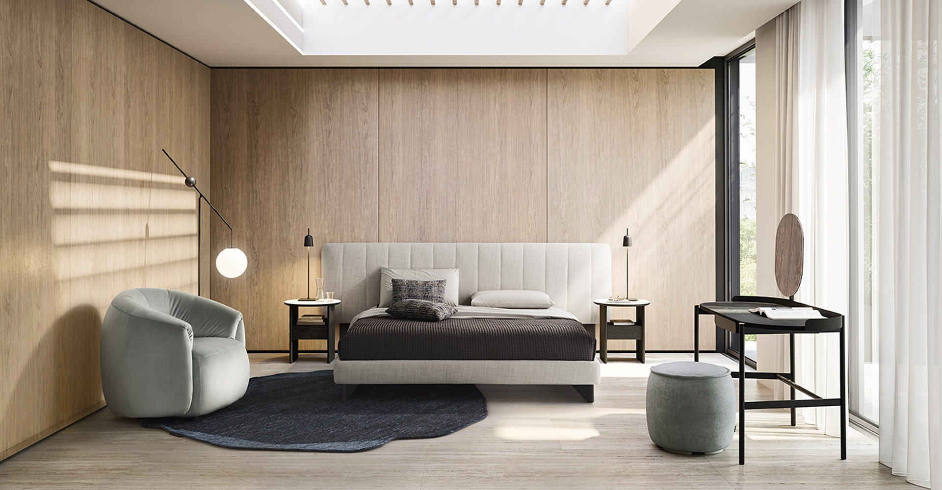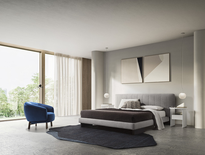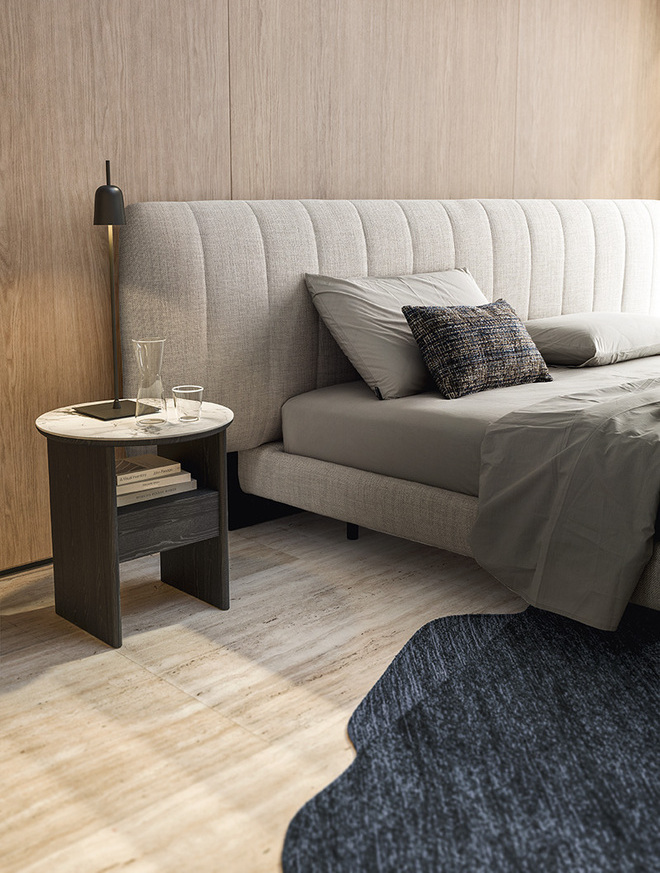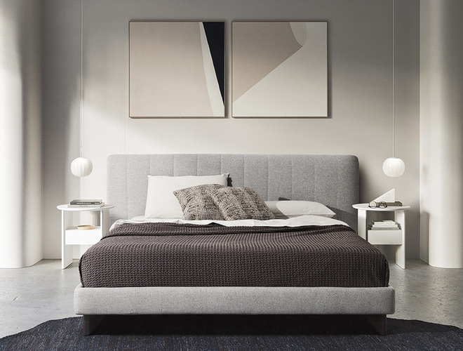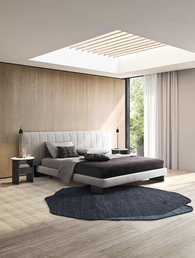 Kilian is a bed with a firm and welcoming presence. The strong and bold lines are soft and elegant at the same time, which is particularly evident in the mo-nolithic design of the legs. Available with a narrow or wider headboard that welcomes the bedside table. The bed is available in the suspended bed-ring ver-sion or in the container bed-ring version.