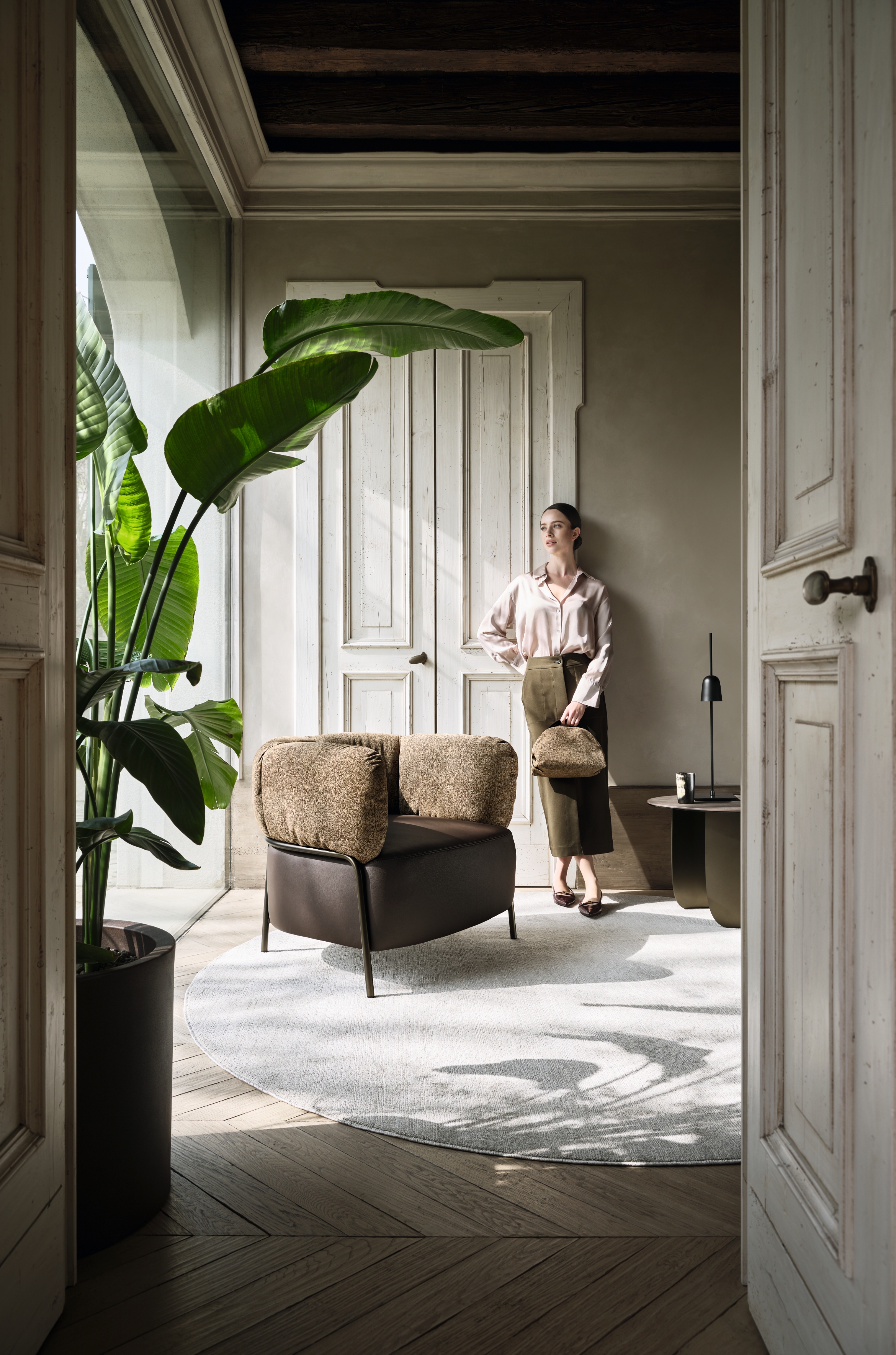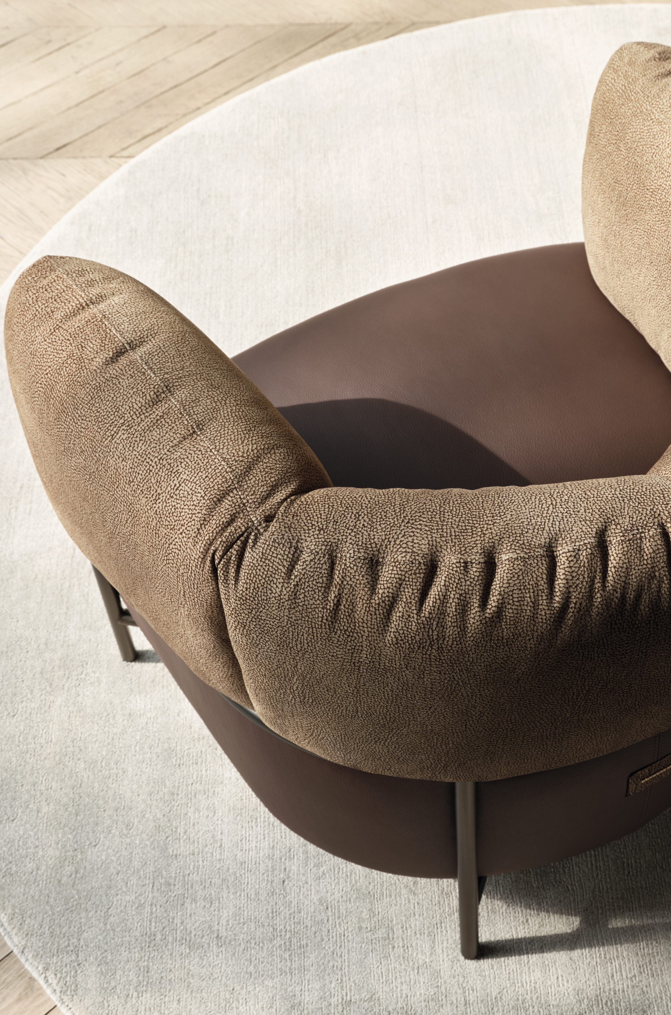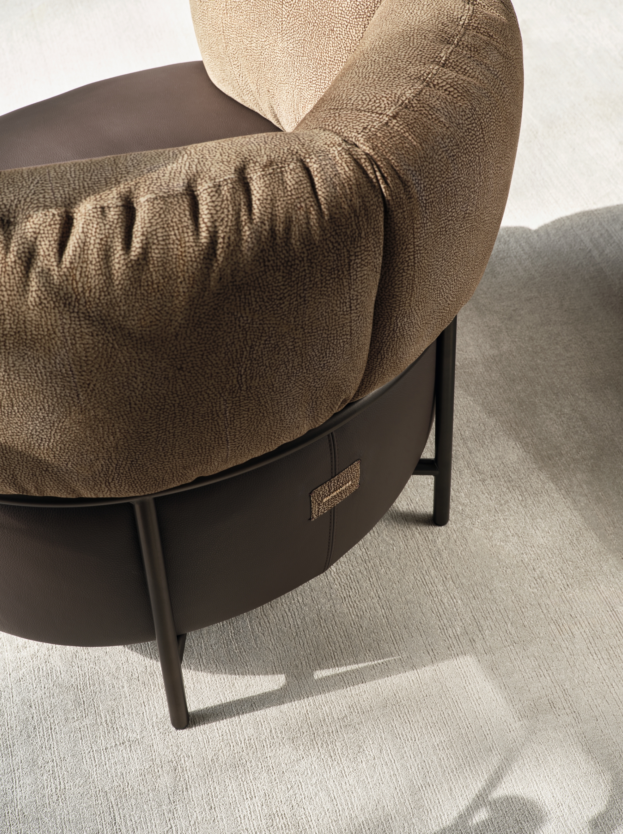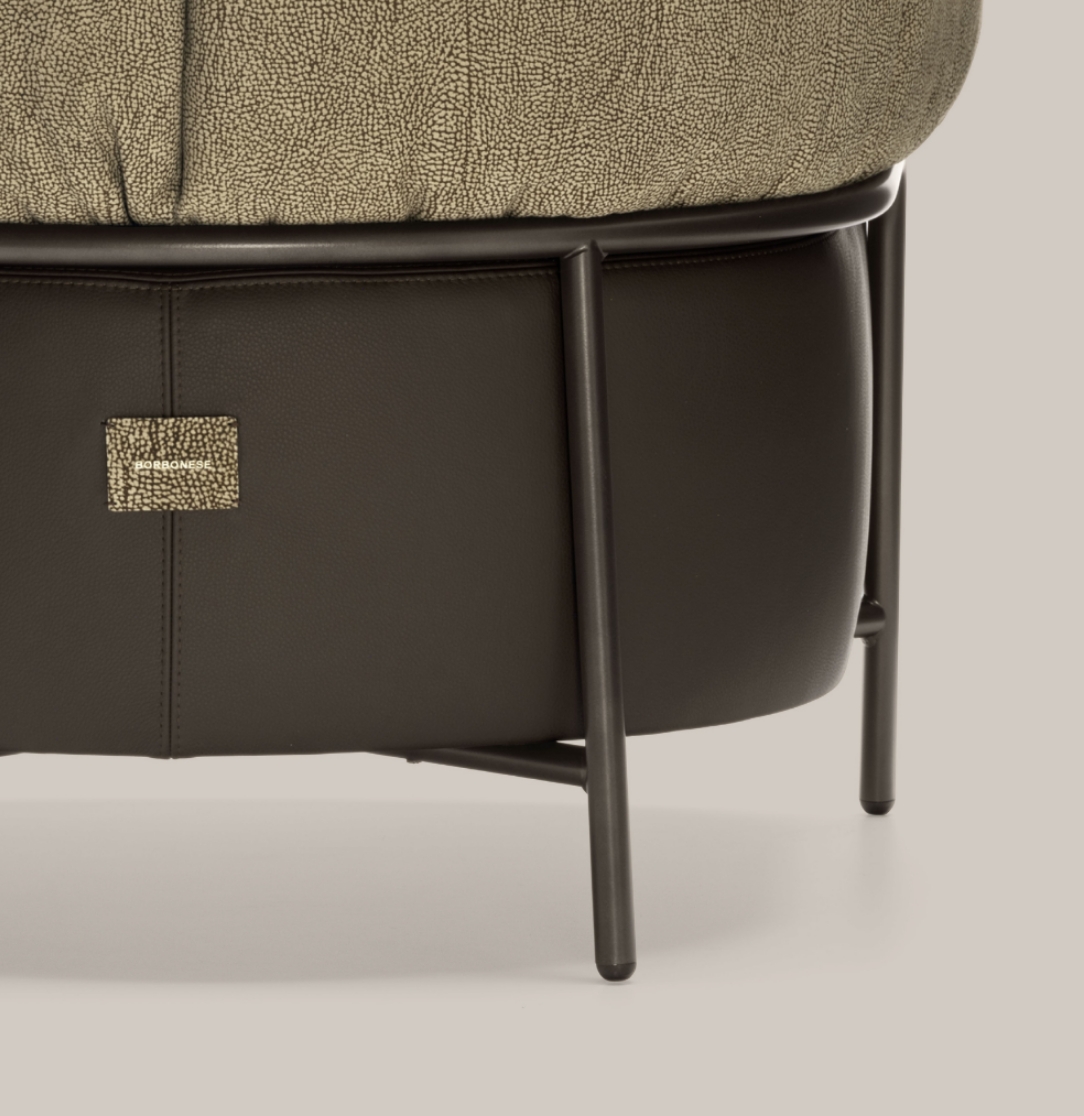 Borbonese’s iconic OP suede envelops the soft backrest, harmonising with the chocolate leather seat and bronze metal frame, resulting in a design that is both unique and refined.