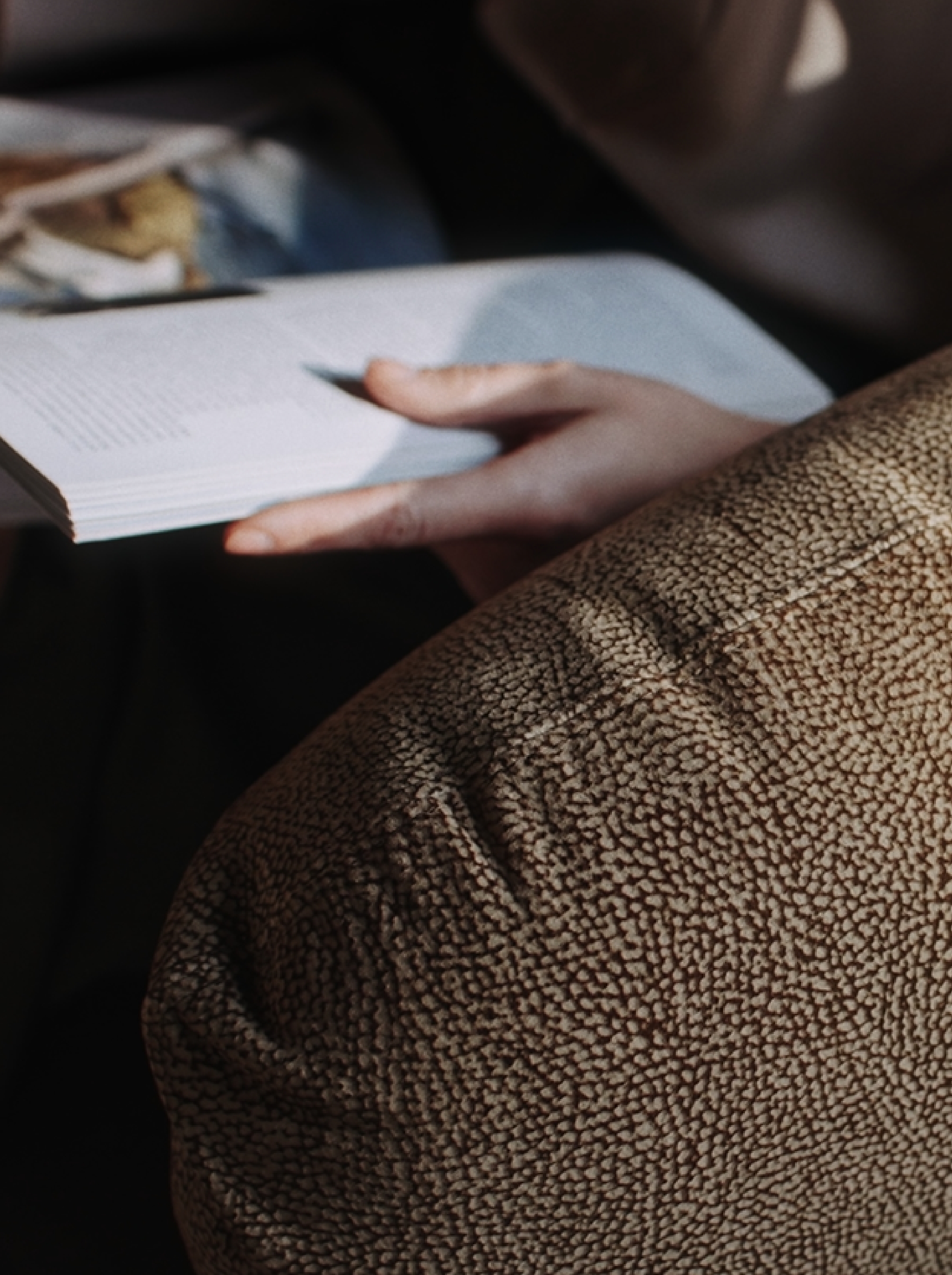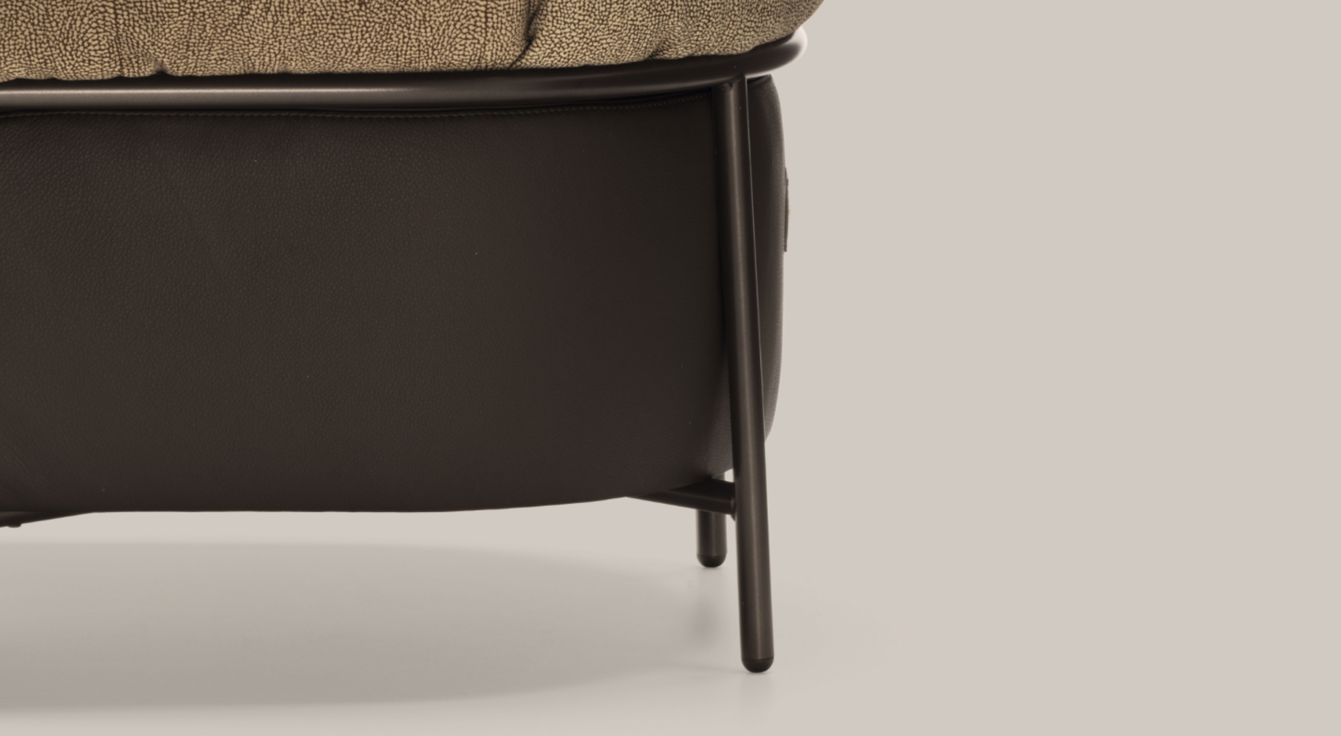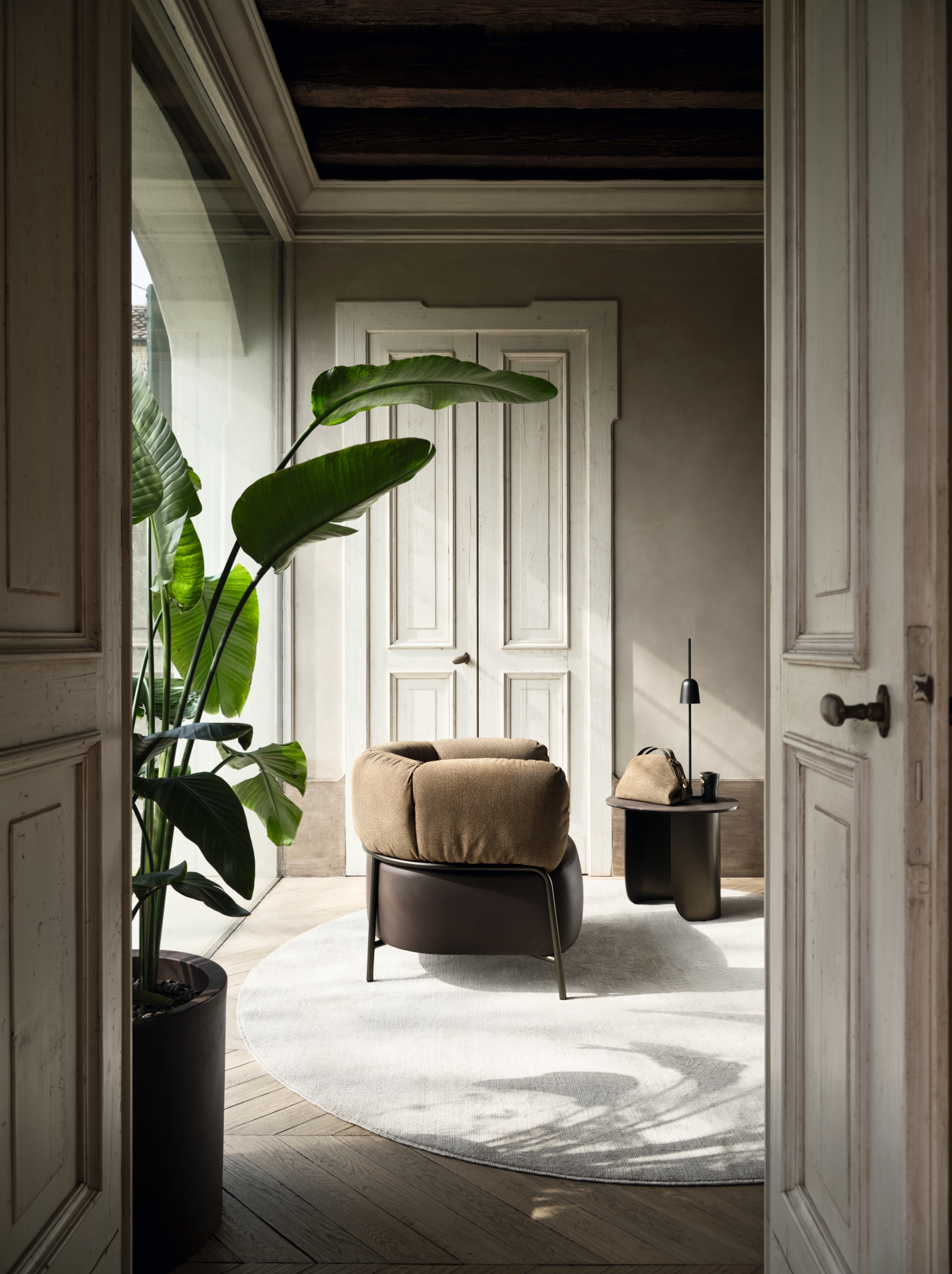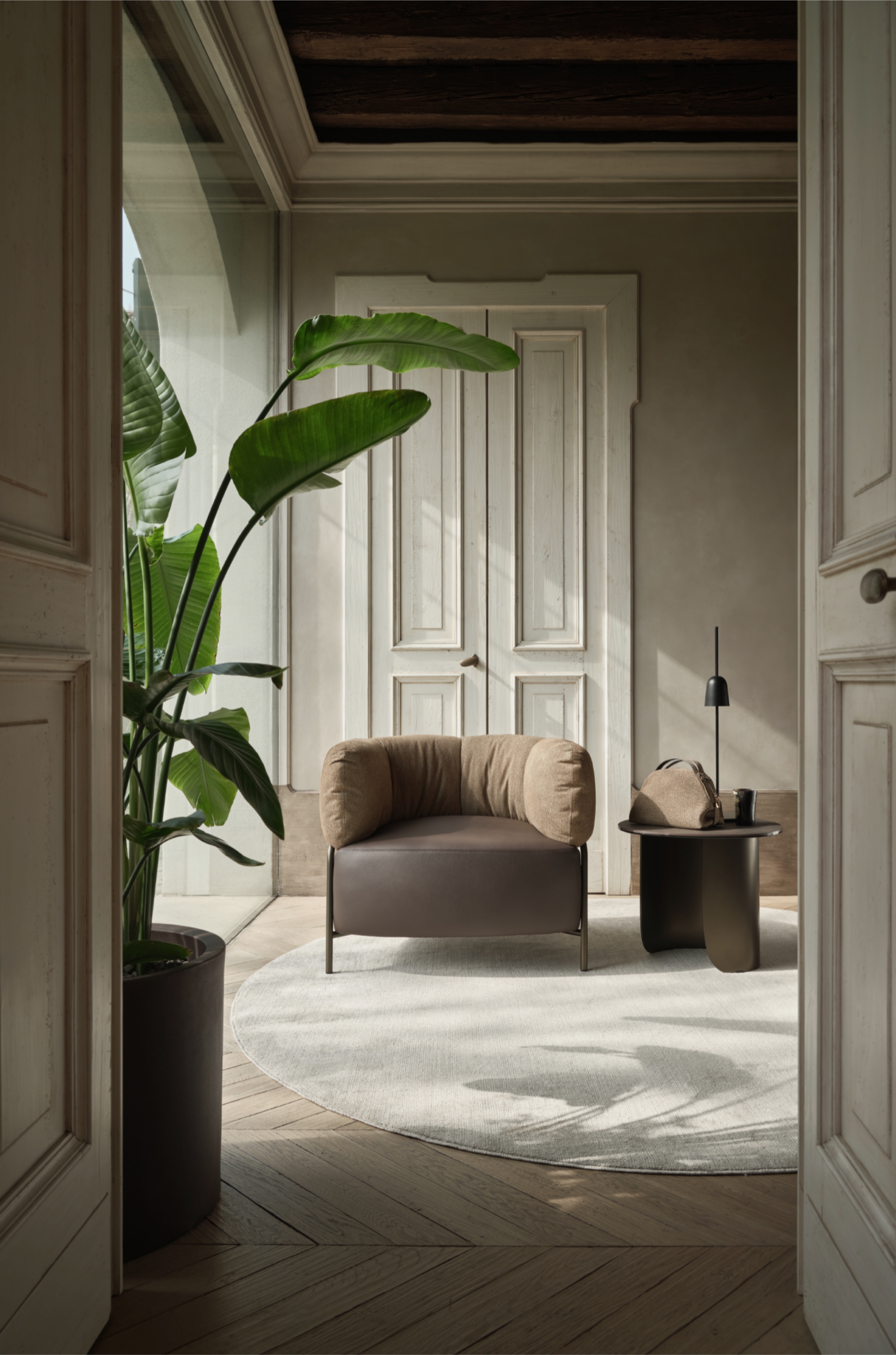 Borbonese’s iconic OP suede envelops the soft backrest, harmonising with the chocolate leather seat and bronze metal frame, resulting in a design that is both unique and refined.