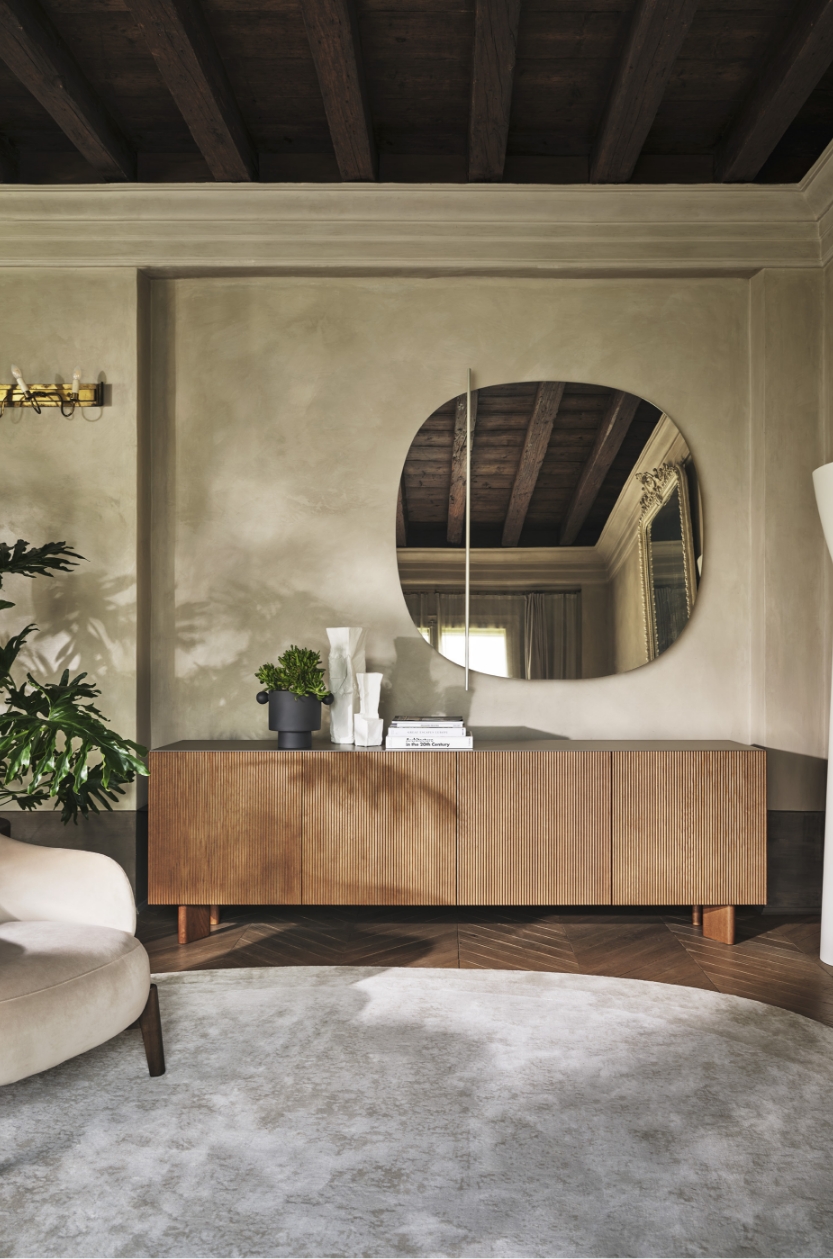 This year, Calligaris living room furniture undergoes a true revolution: a modular sideboard system is born, combining aesthetics and versatility. It is now possible to create unique compositions thanks to a variety of doors and bases, from sculptural details to more essential lines, adapting to every style and space.